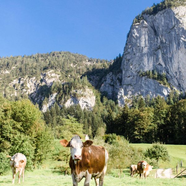 Ein Spaziergang entlang der Saalach führt durch idyllische Auwälder, vorbei an grünen Wiesen und dem gemütlichen Hof, bis hinauf in die Berge. Für die Abenteuerlustigen geht es über steile Hänge, die noch von Hand bewirtschaftet werden, in Richtung Köstlerberg. Oben angekommen, kannst du das faszinierende Panorama genießen – und die mächtige Felswand des Feuerhörndels wacht majestätisch über allem.